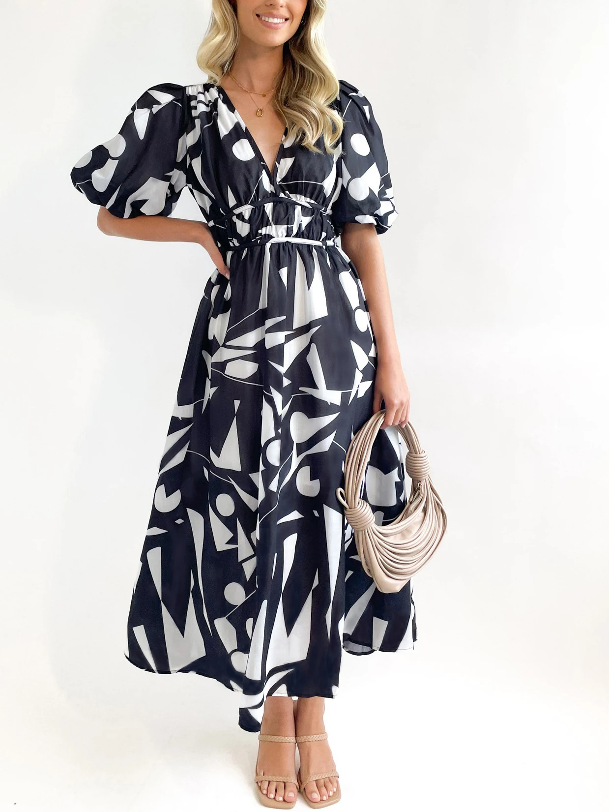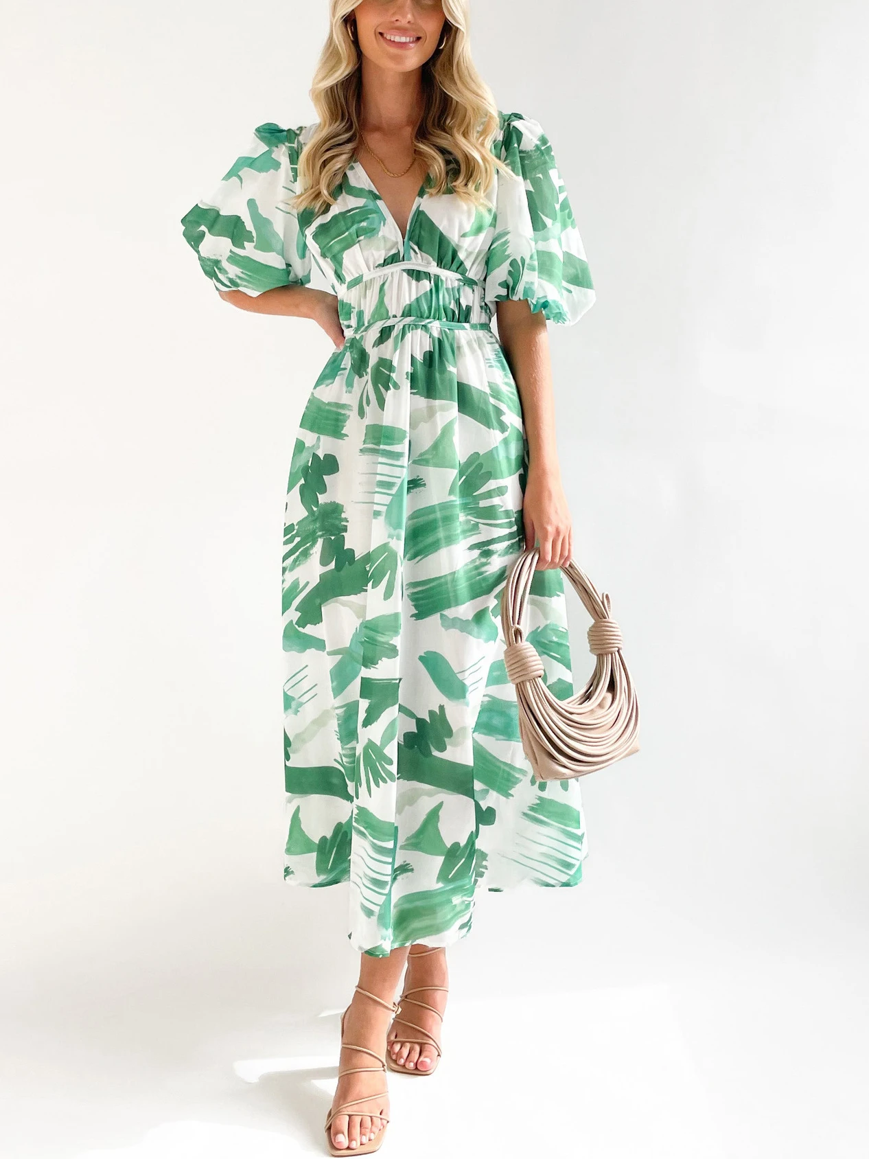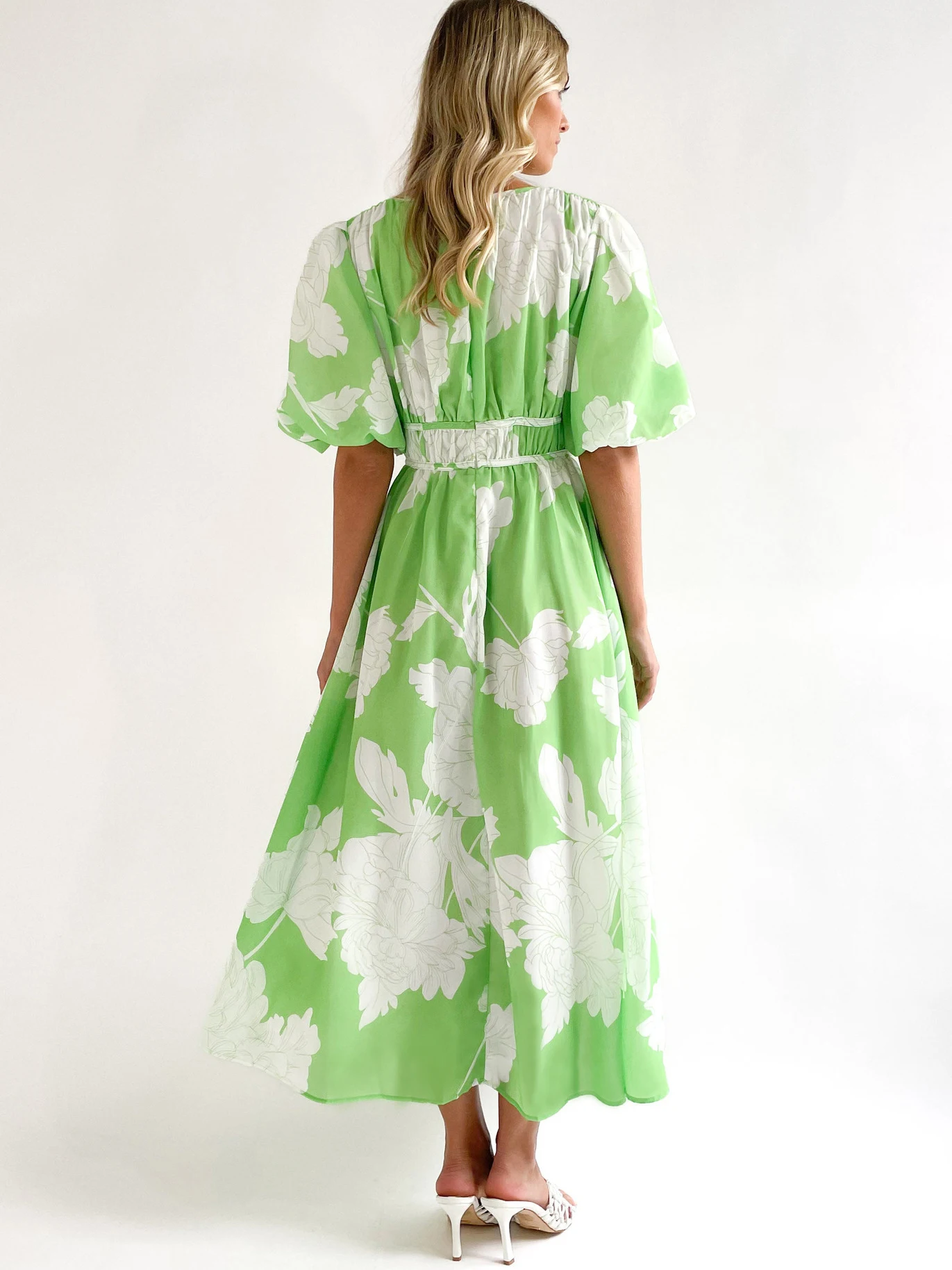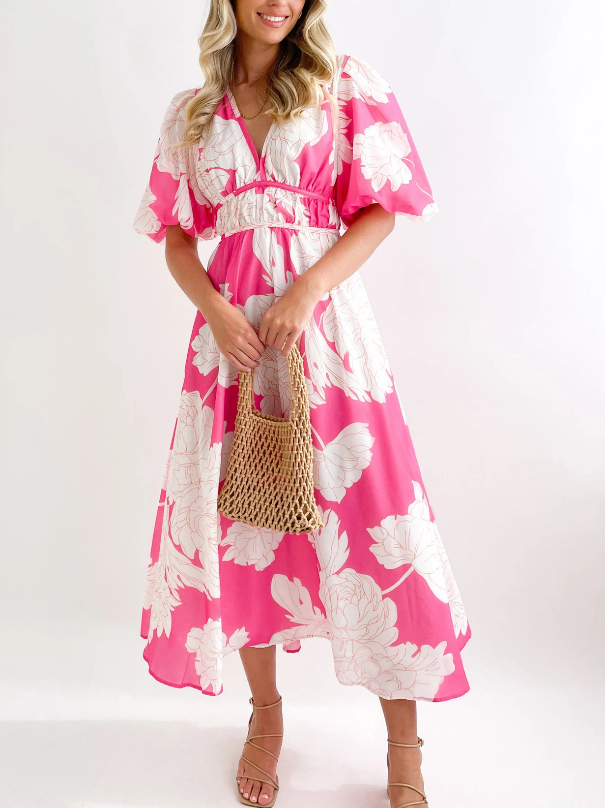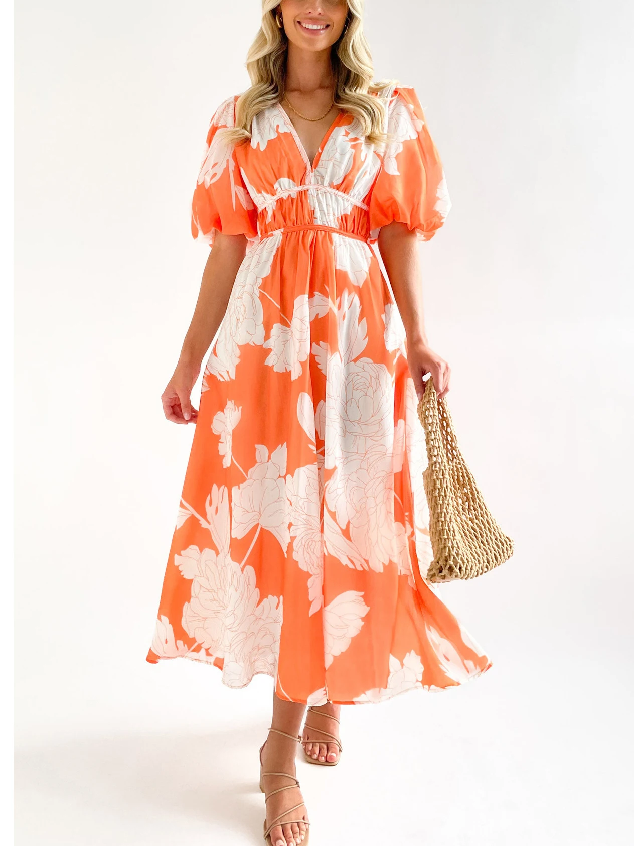 Step into effortless elegance with this floral print maxi dress, perfect for spring and summer days. Featuring a flattering V-neckline, short sleeves, and a flowy A-line silhouette, it’s a versatile piece for both casual wear and office chic.