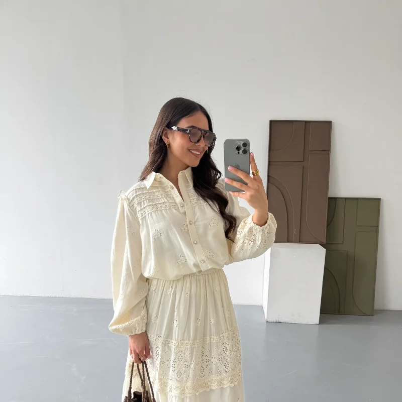 Bring elegance and charm to your summer wardrobe with this two-piece shirt and skirt set. Designed with intricate embroidery and delicate hollow-out details, this outfit perfectly blends sophistication with comfort. Whether styled for a party, a chic evening, or a stylish day out, it’s a versatile statement piece.