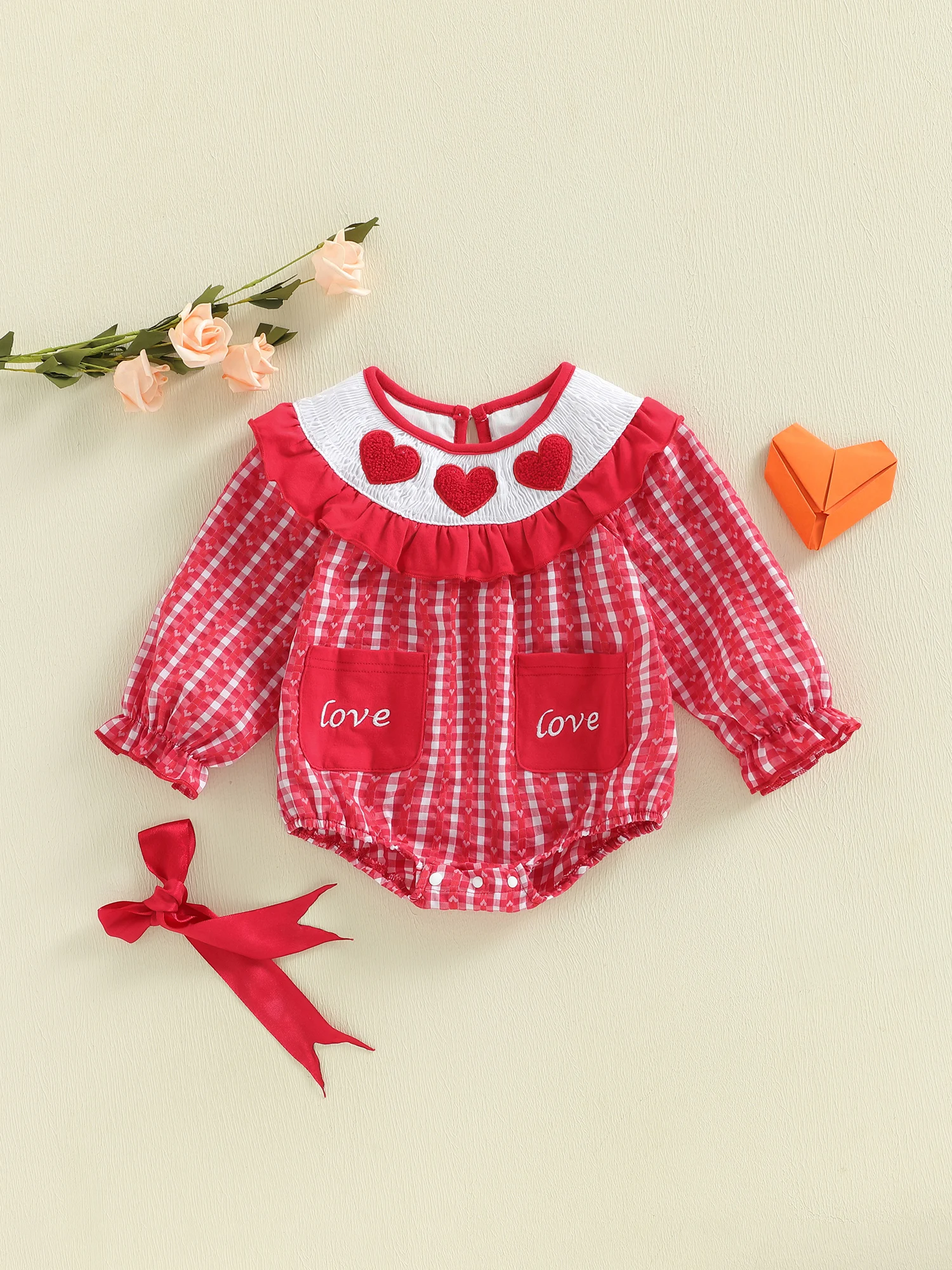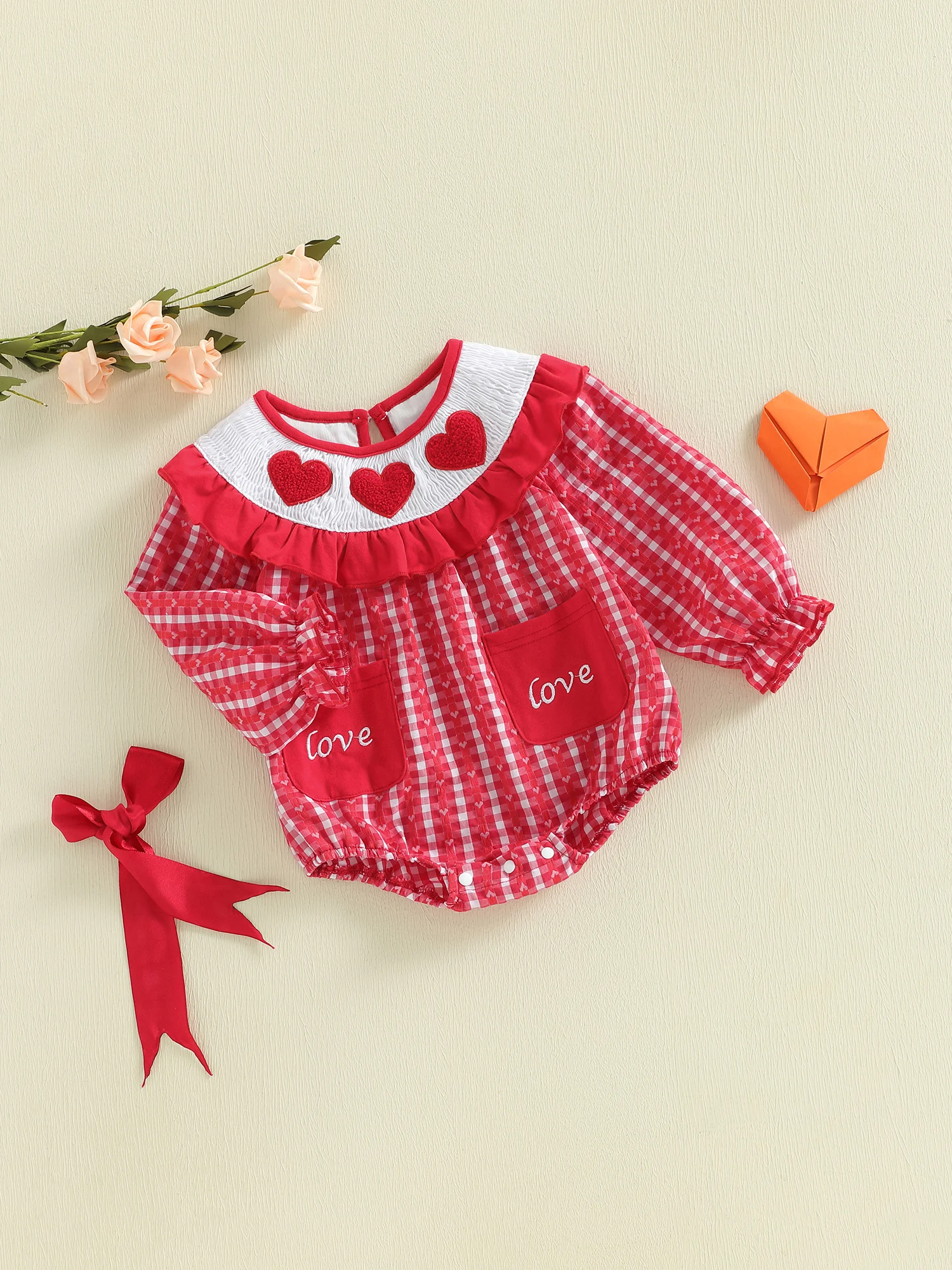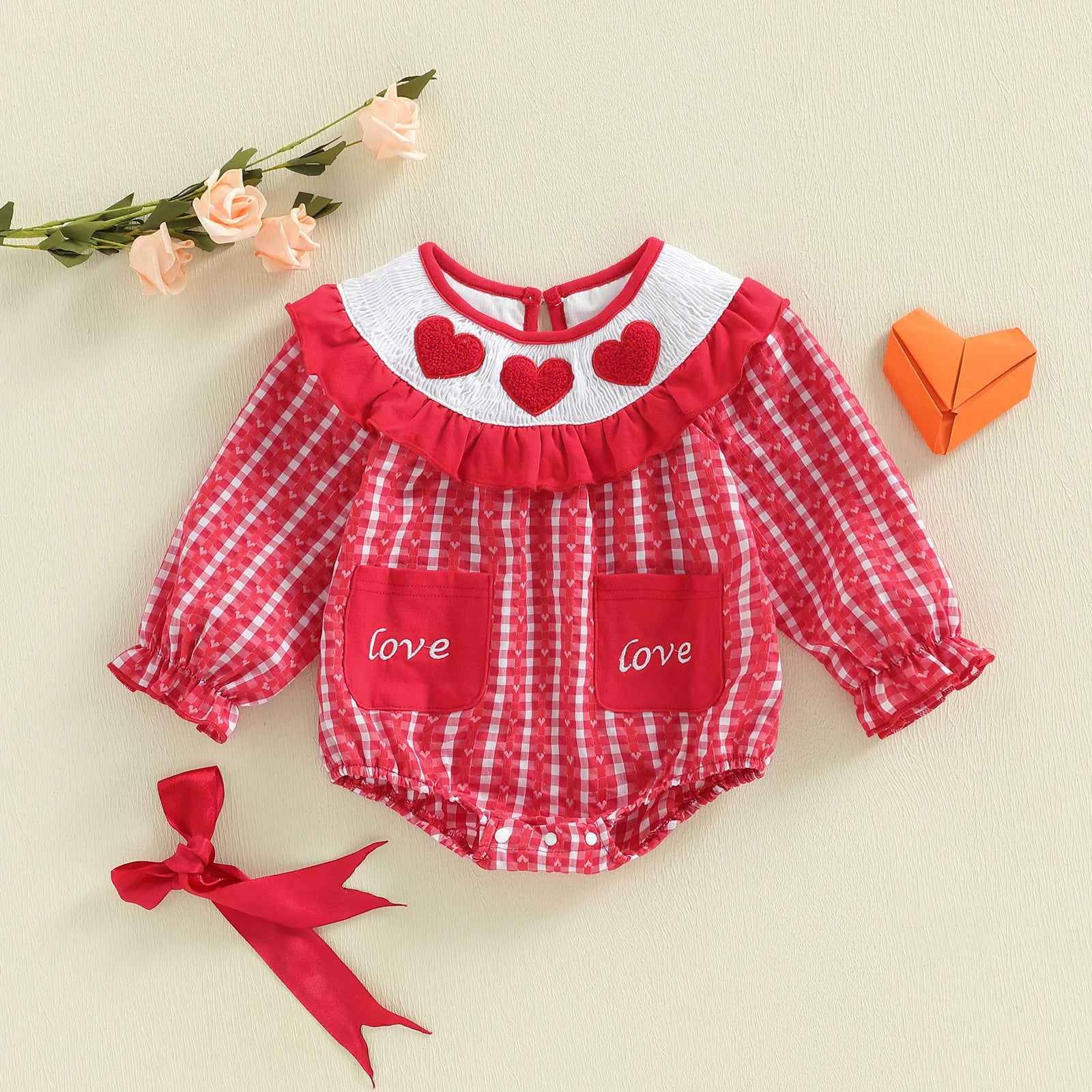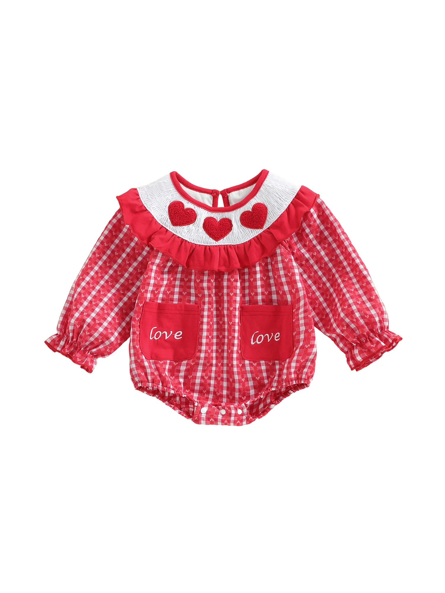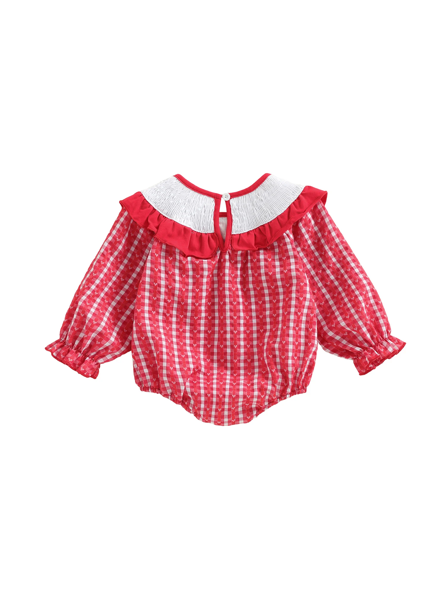 Celebrate your little one’s first Valentine’s season with this beautifully designed long sleeve romper. Featuring delicate heart embroidery and a classic smocked detail, this outfit blends comfort and charm for everyday wear or special occasions.