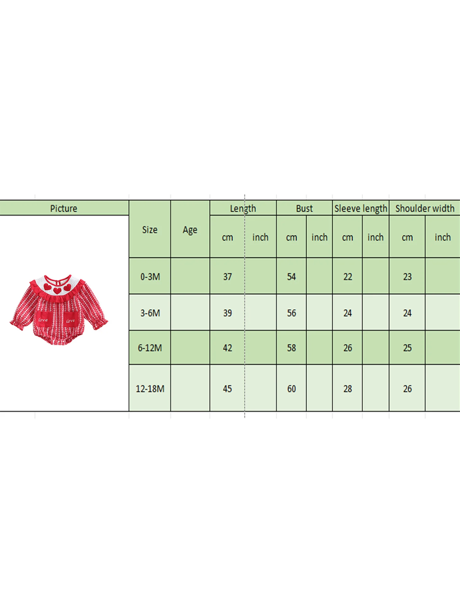 3-6M Length: 15.4 Bust: 22.0 Sleeve Length: 9.4 Shoulder Width: 9.4 Advised Age: 3-6 Months