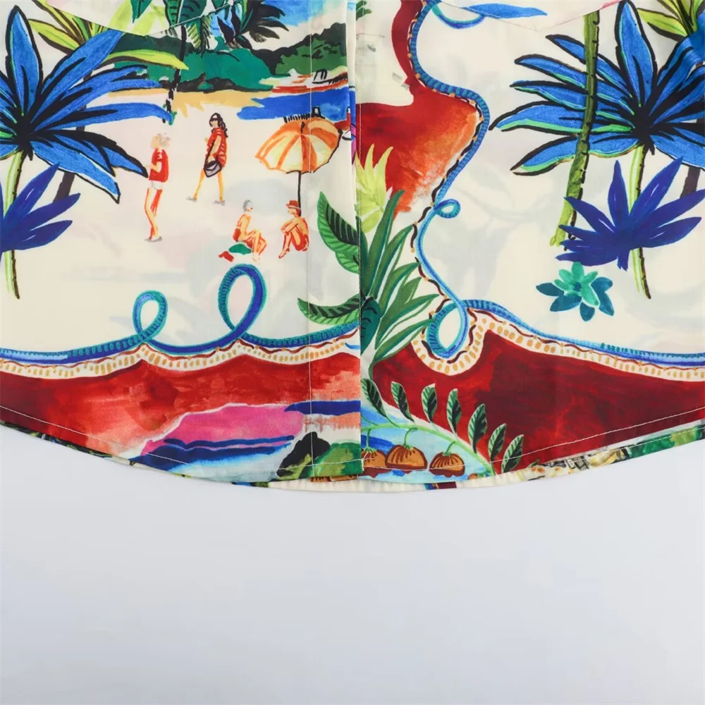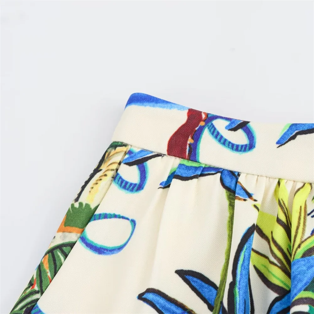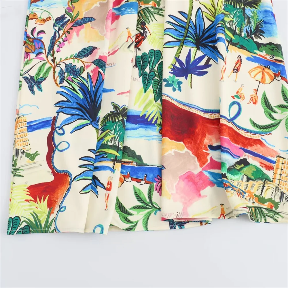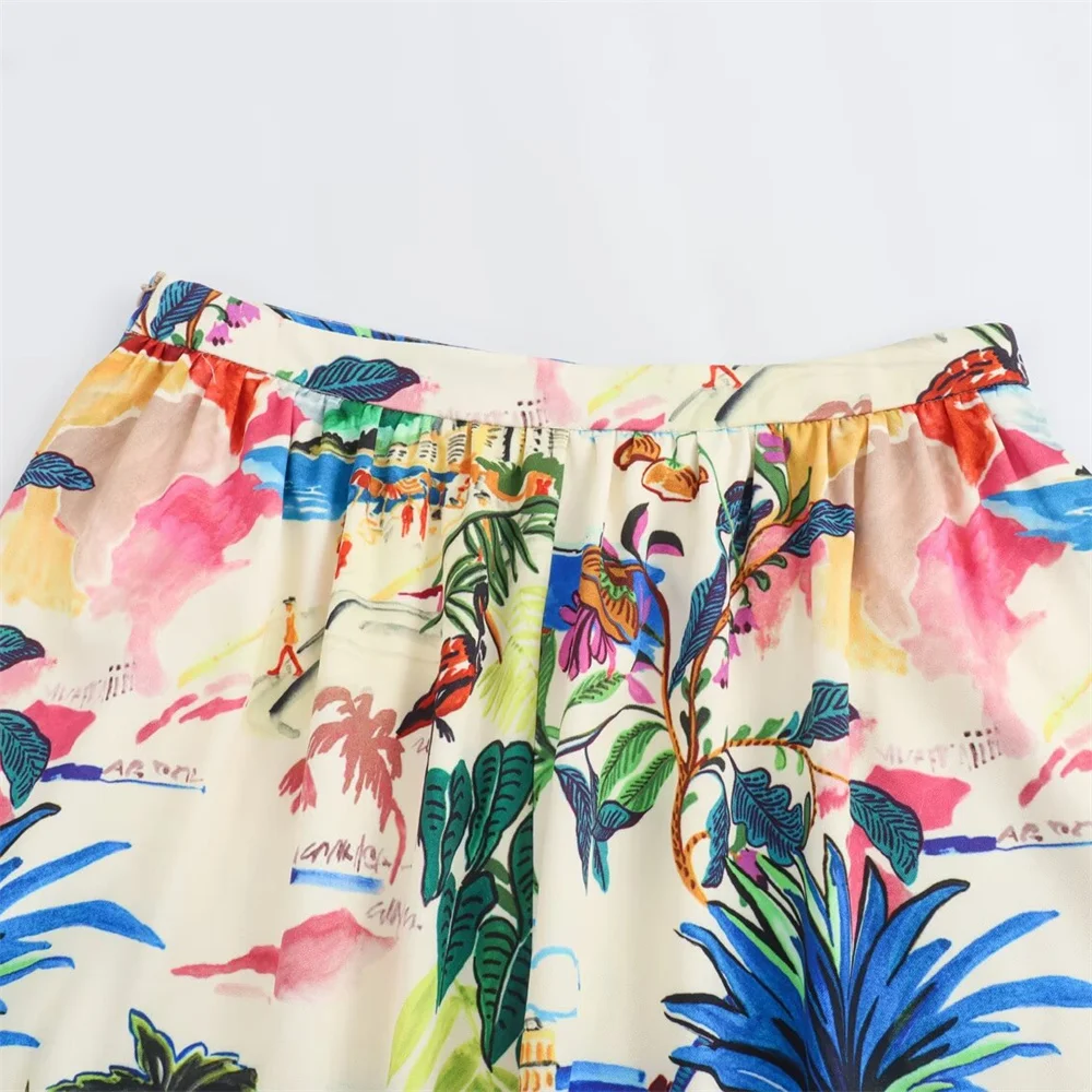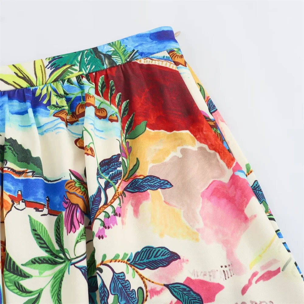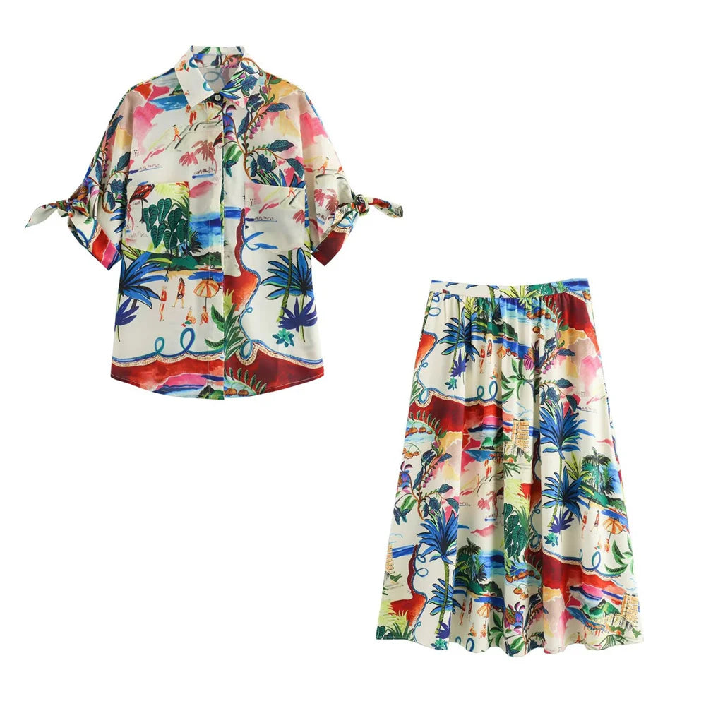 - Two-piece set: printed short-sleeve shirt + high-waist midi skirt