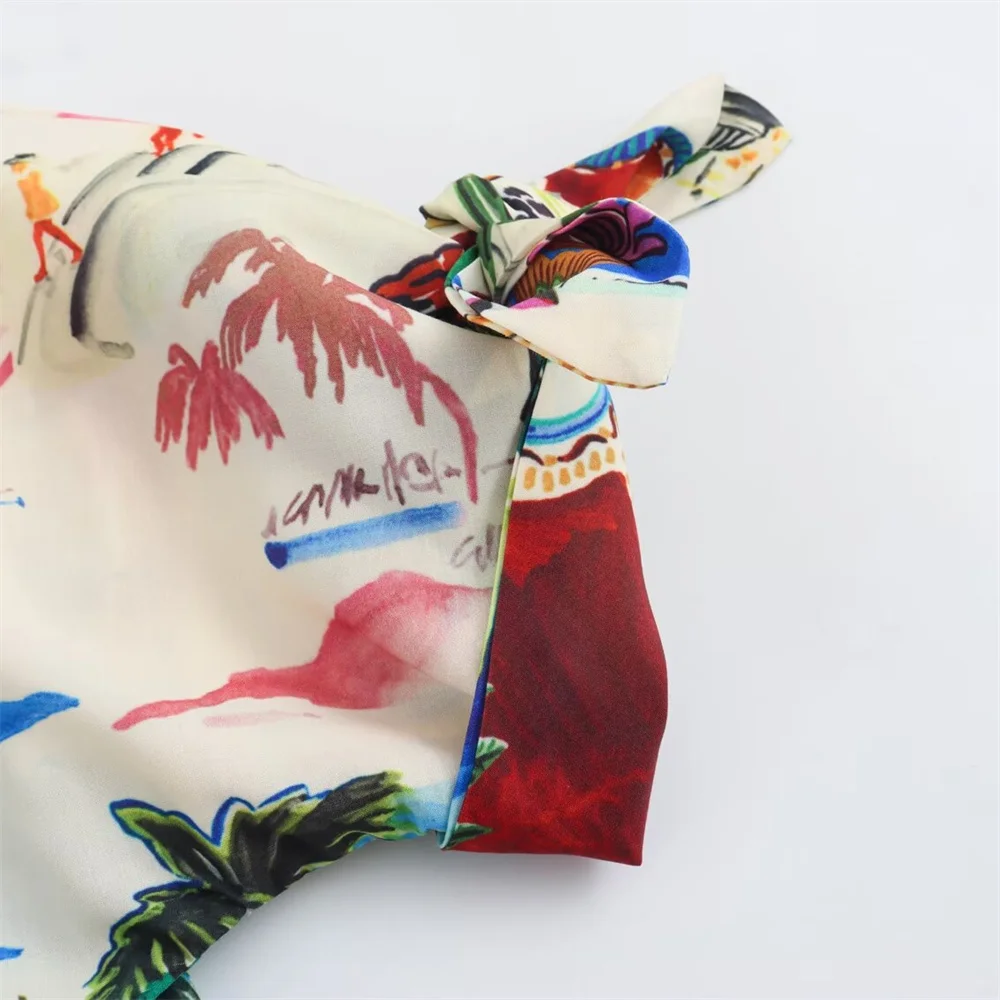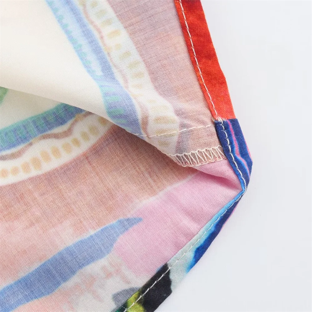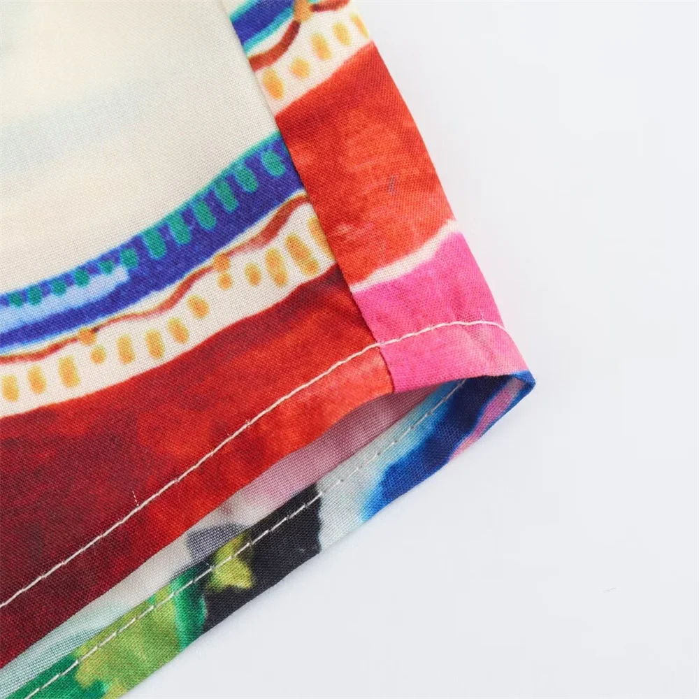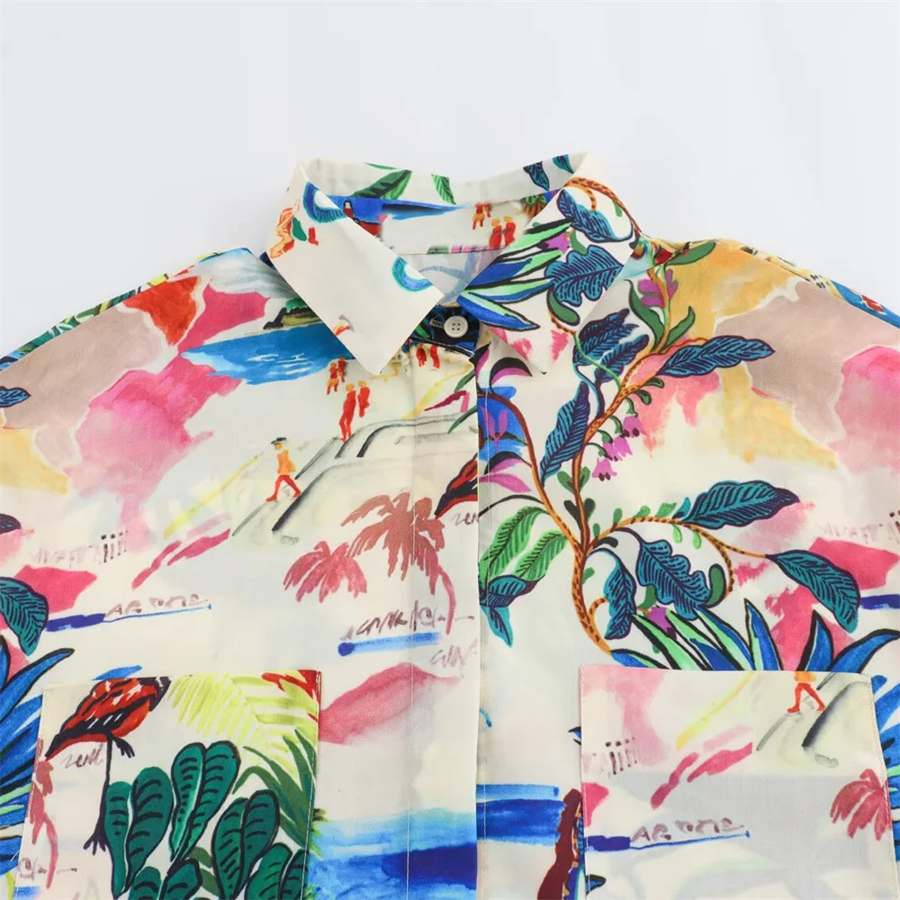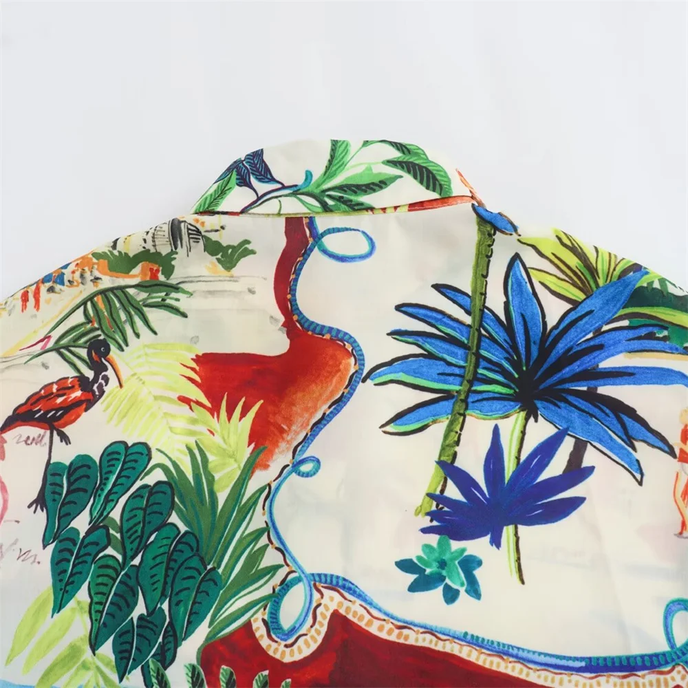 - Two-piece set: printed short-sleeve shirt + high-waist midi skirt