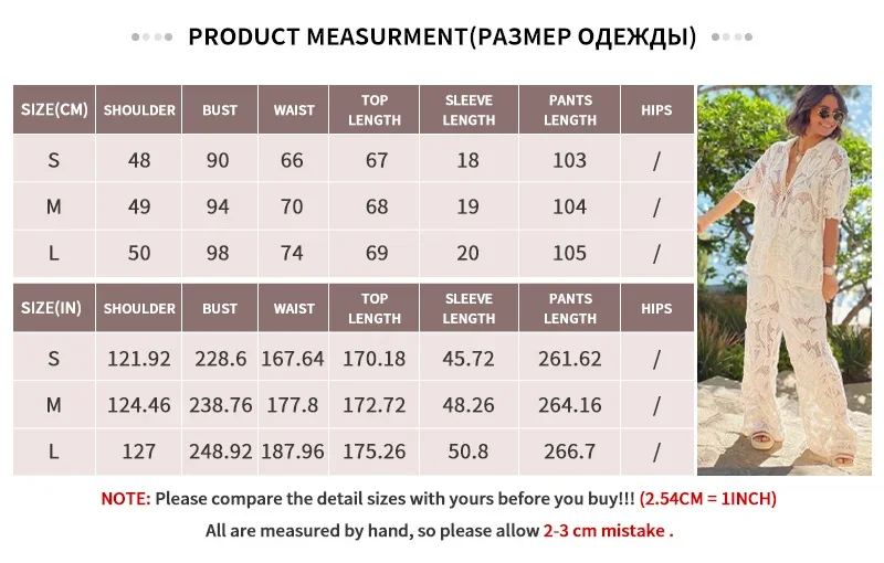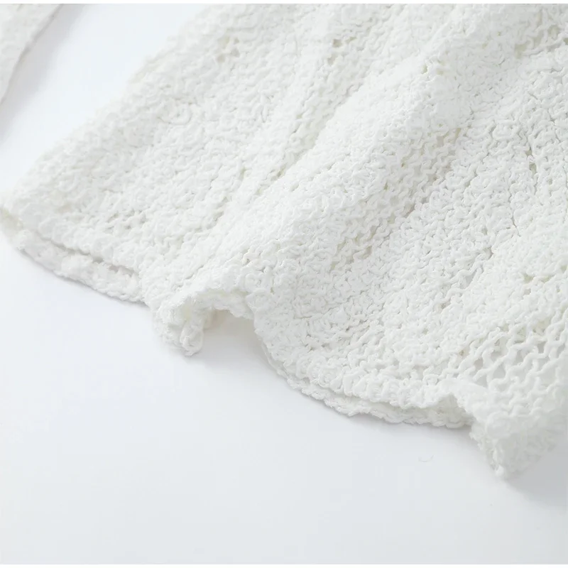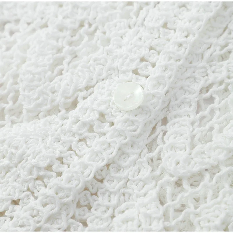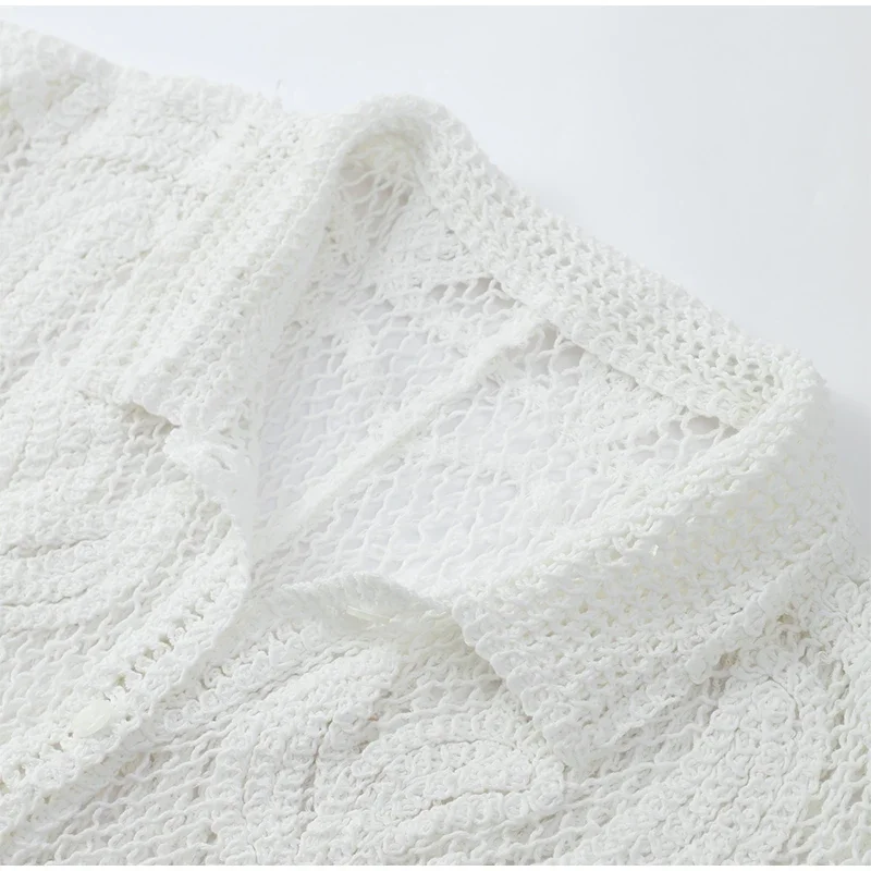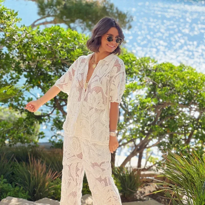 Stay effortlessly chic and comfortable with this crochet-inspired two-piece set. Designed for both lounging and vacation vibes, this outfit pairs a short-sleeved button-up top with matching wide-leg trousers for a relaxed yet stylish look.