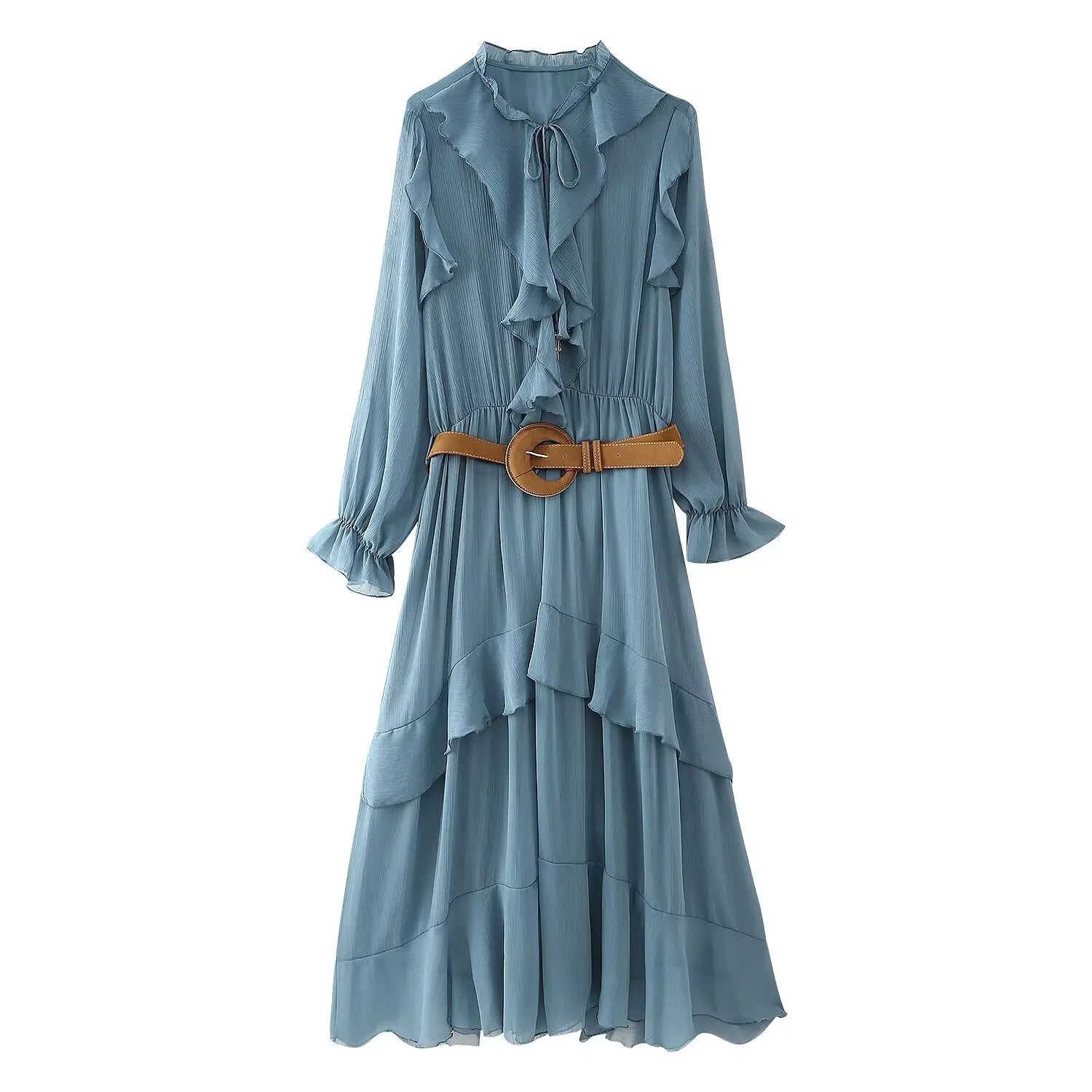 Women’s Elegant Belted Dress – European & American Style with Layered Detail
