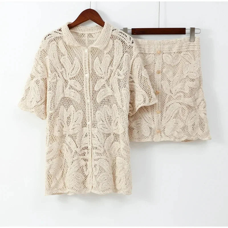 Women’s Hollow Out Knitted Skirt 2-Piece Set – V-Neck Top & Mini Skirt