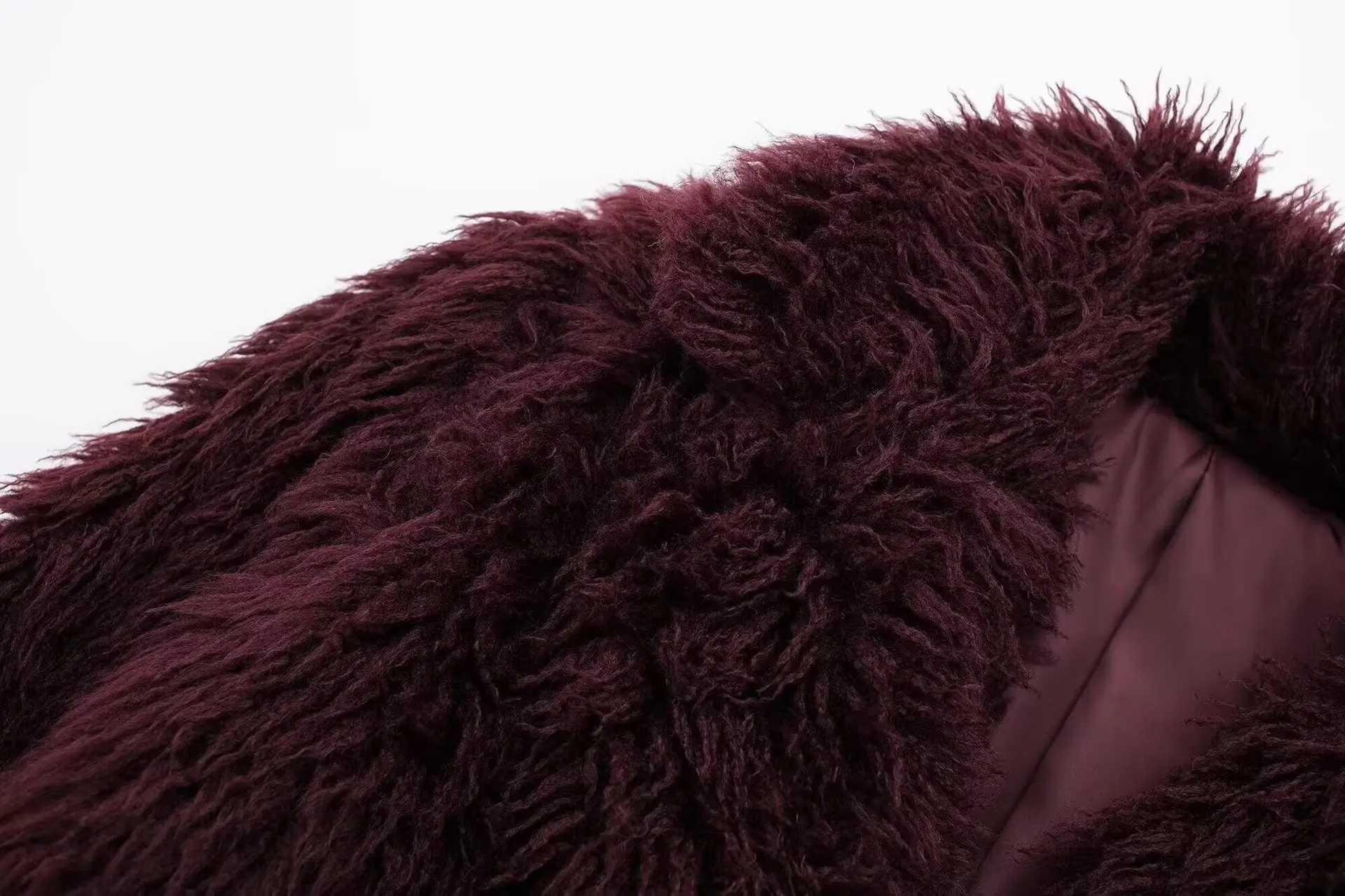Step into timeless elegance with this vintage-inspired faux fur coat. Crafted in a rich burgundy shade with a thickened fleece lining, it’s designed to keep you cozy and stylish throughout the colder months. Perfect for both casual streetwear and office chic, this coat blends warmth, comfort, and sophistication.