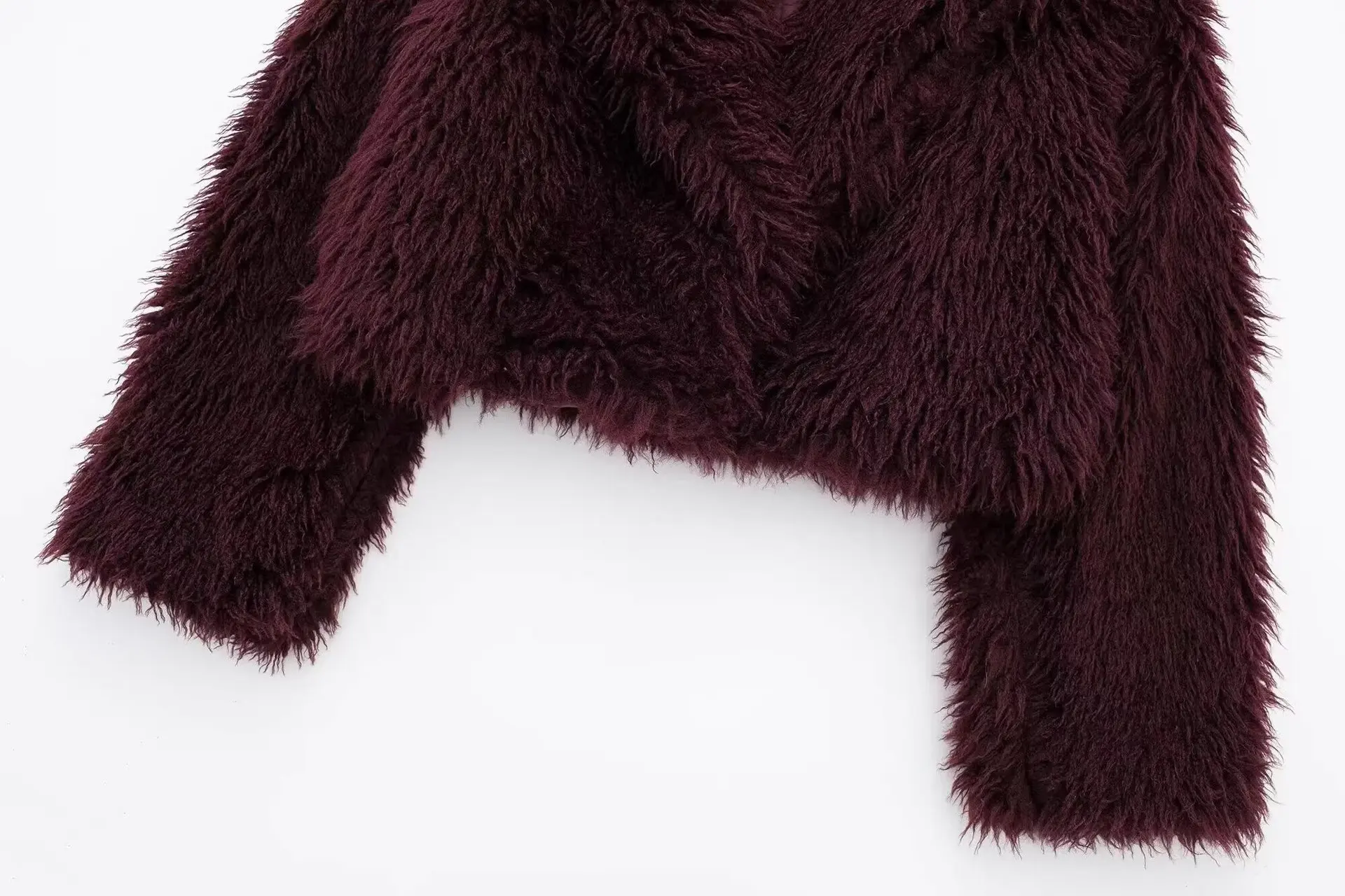 - Vintage Design: Burgundy faux fur with lapel collar for a chic retro touch