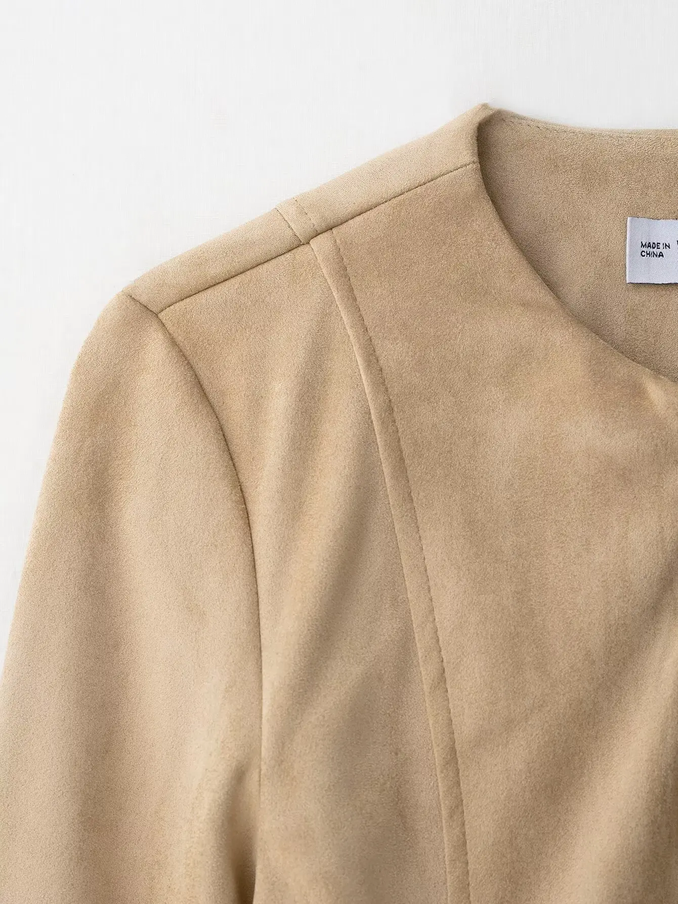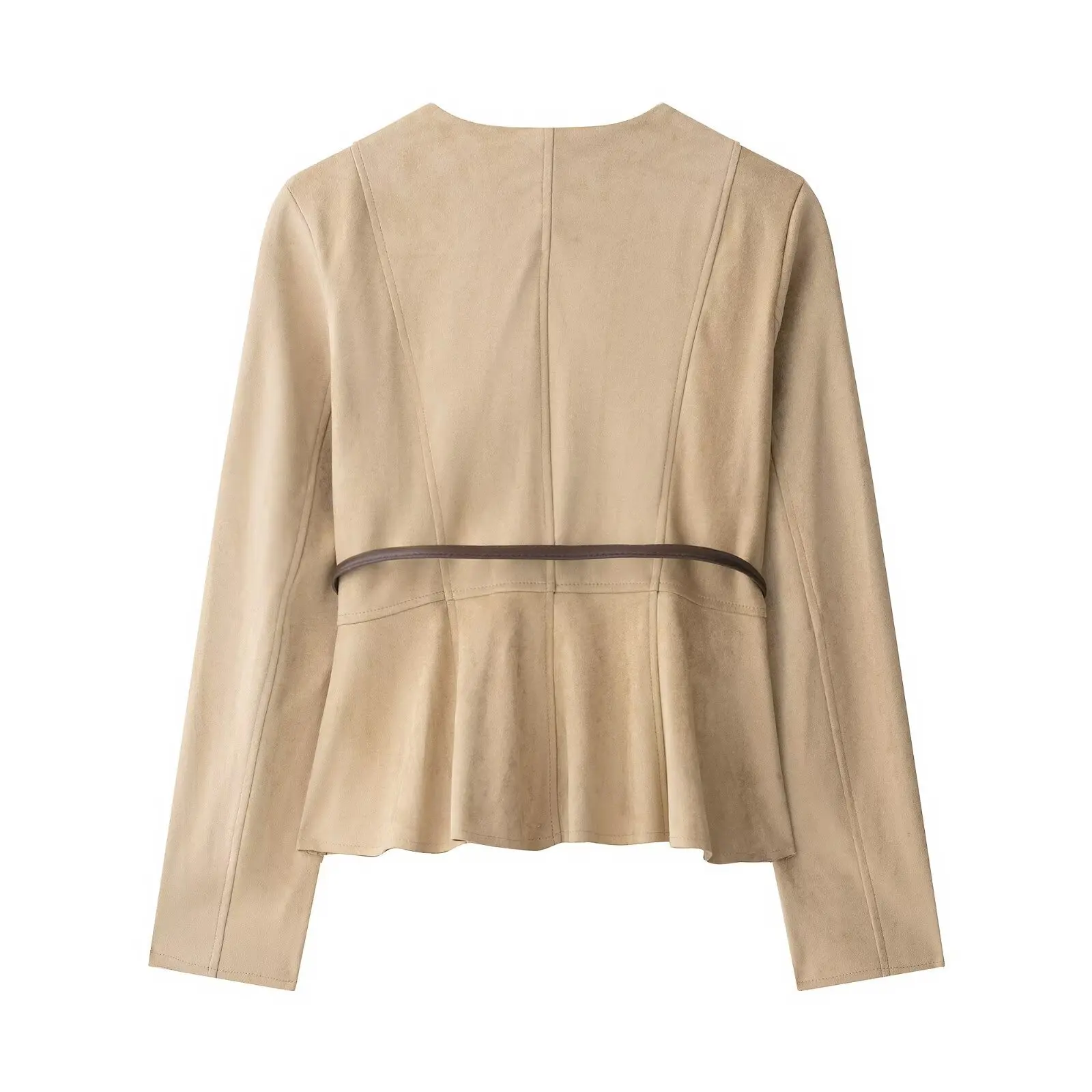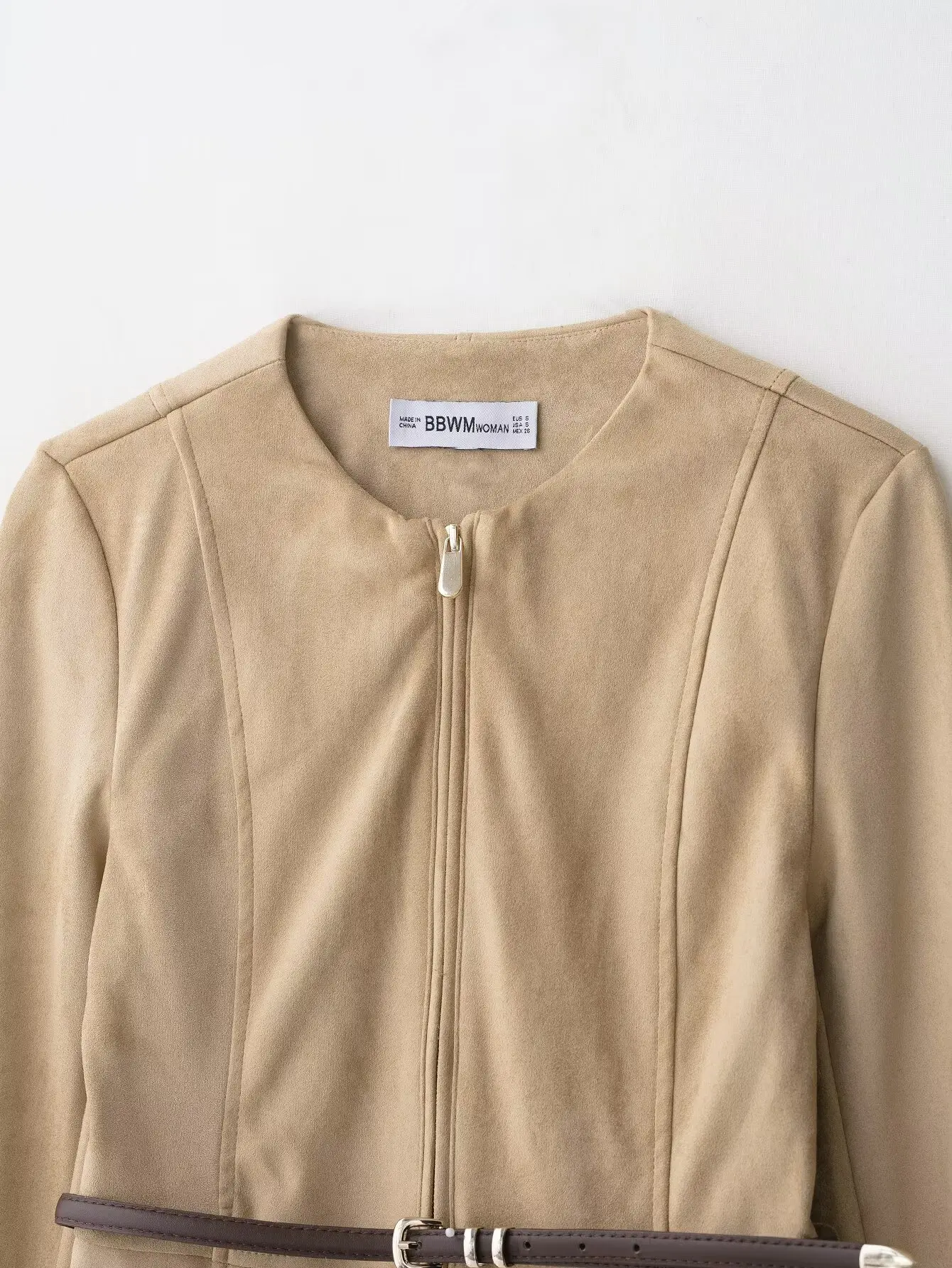 Women’s Vintage Suede Jacket – O-Neck Belted Coat