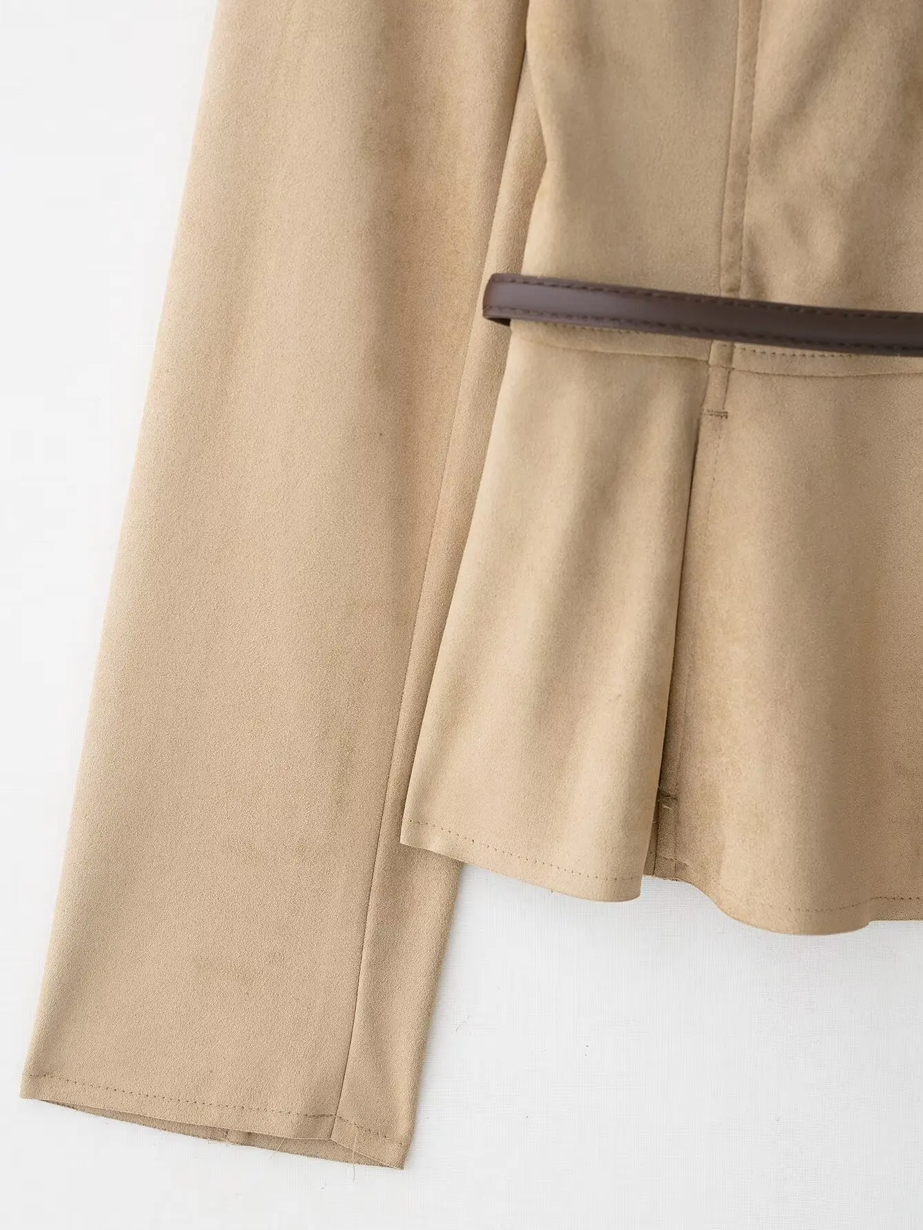 This jacket is a must-have layering piece for fall, offering both sophistication and versatility. The belt cinches your waist for a chic look, while the suede-like texture gives it a luxurious vintage finish. Pair it with dresses, trousers, or skirts for an effortlessly stylish autumn outfit.